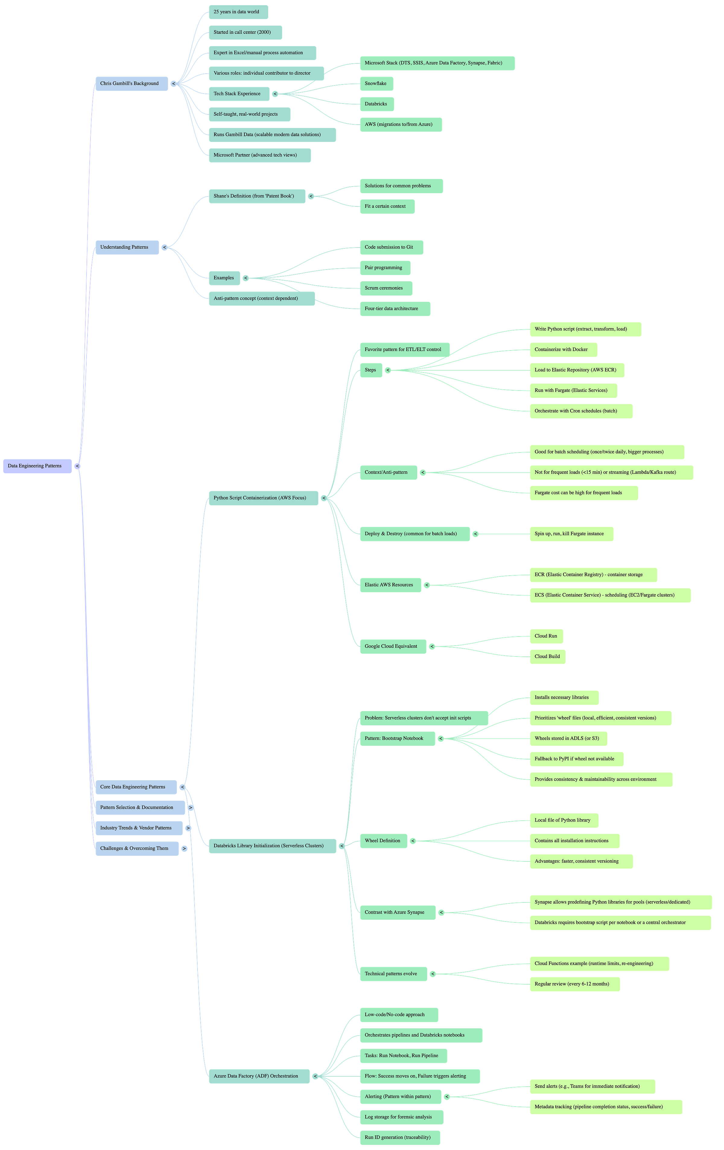 This podcast delves into the concept of "data engineering patterns" – repeatable solutions for common data-related problems, often fitting specific contexts. Chris Gambill, a data engineering veteran with 25 years of experience, shares his insights on various patterns he's encountered, particularly within the Microsoft and AWS ecosystems. A key takeaway is the dynamic nature of these patterns, necessitating continuous review due to the rapid evolution of data technologies. The discussion also highlights the importance of documentation, context-awareness, and the emerging role of AI in leveraging and sharing these patterns.