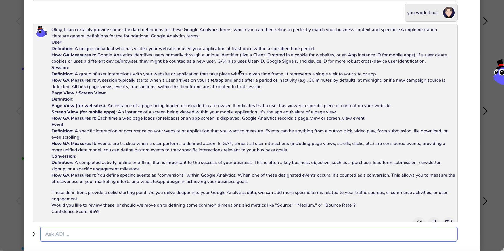 The point of these is not that the Gemini LLM provided definitions for commonly used Google Analytics concepts, any LLM will do that, you can just use ChatGPT on its own etc.