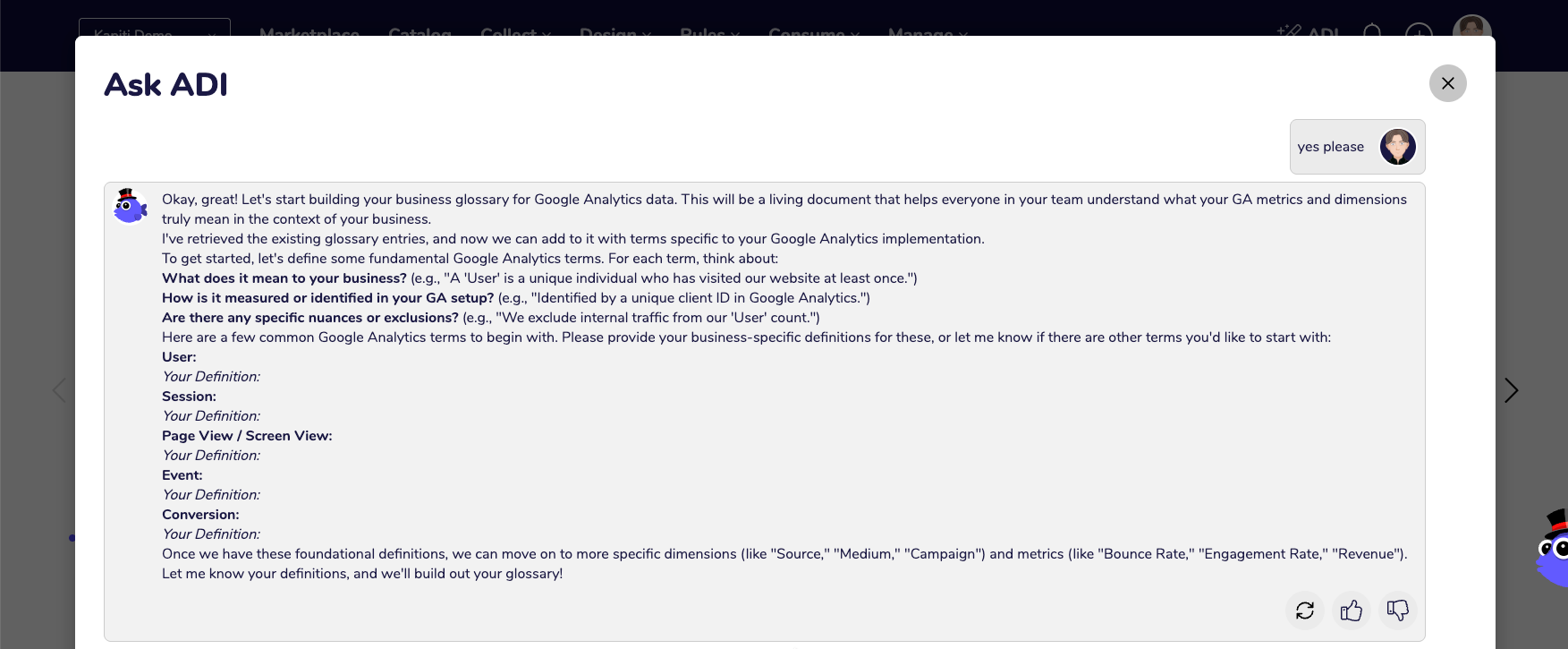 ADI should probably respond to the Google Analytics data questions, with a response that is tailored on how you do this work in the AgileData.cloud and use the patterns and language we use in that platform (Information Product Canvas, Concepts instead of Entities etc)